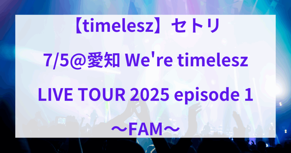 【timelesz】セトリ 7/5@愛知 We’re timelesz LIVE TOUR 2025 episode 1 〜FAM〜